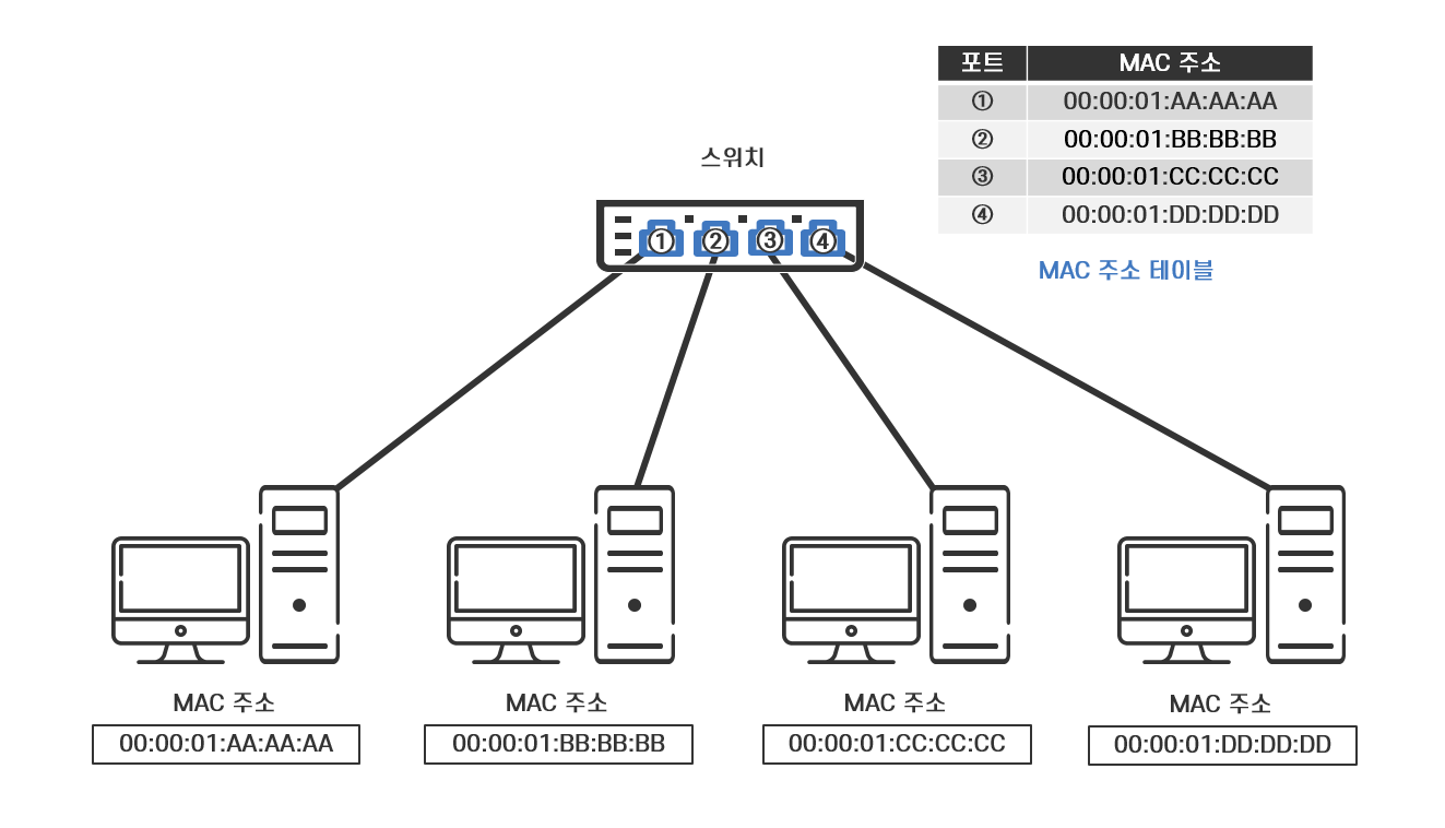 스위치는 자신의 포트에 연결되어 있는 컴퓨터의 MAC 주소를 학습하고 기억하는 기능이 있습니다. 이 기능을 통해 스위치로 전송되는 데이터를 제어하고 올바른 수신지로 데이터를 전달합니다.