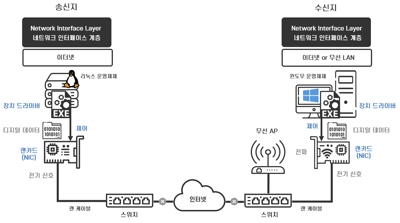 마찬가지로 컴퓨터 운영체제(OS)에 랜카드(NIC)를 작동시키기 위한 장치 드라이버가 설치되어야 컴퓨터가 랜카드를 제어하고 프로토콜을 처리하며 네트워크 인터페이스 계층의 역할을 구현할 수 환경이 만들어집니다.