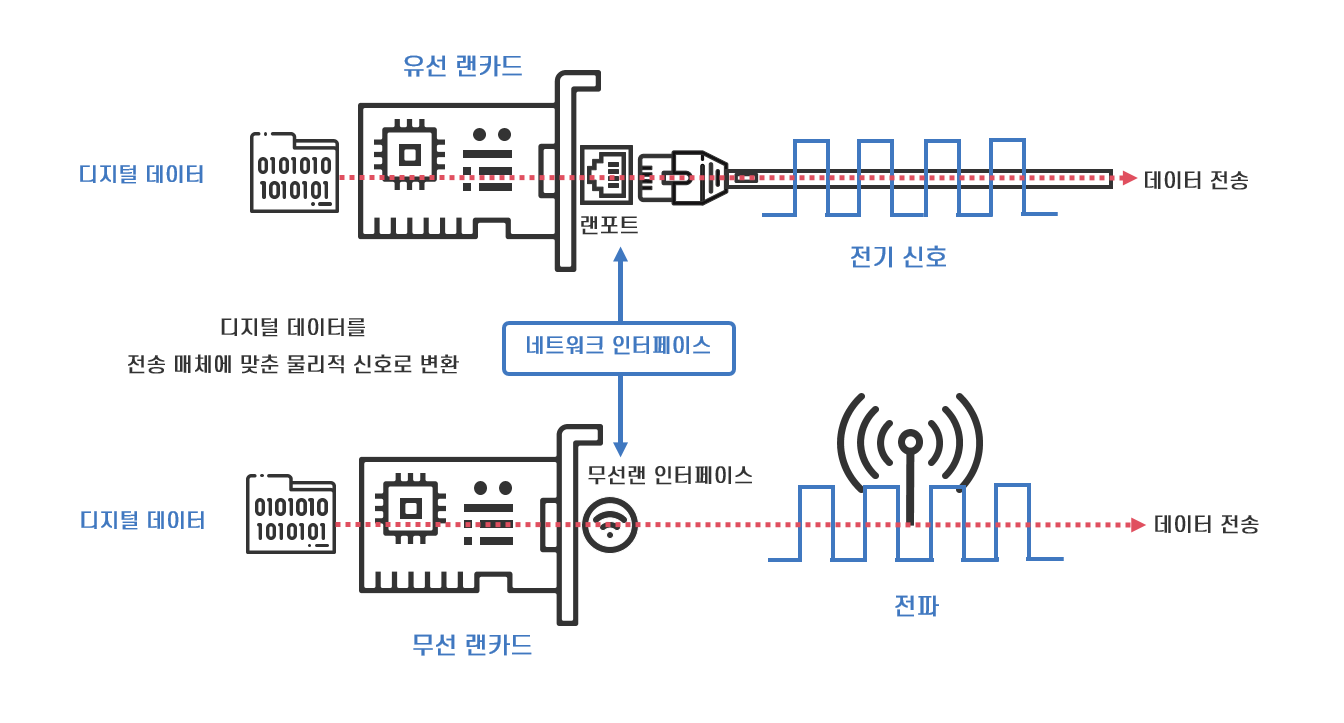 또한 네트워크 인터페이스 카드(Network Interface Card, NIC)라고도 불리는 랜카드는 컴퓨터와 네트워크의 물리적 연결 기능뿐만 아니라 컴퓨터가 만든 디지털 데이터를 전기 신호나 전파같은 물리적 신호로 변환하여 네트워크로 내보내거나, 네트워크로부터 받은 물리적 신호를 디지털 데이터로 변환하는 기능을 갖고 있습니다. 즉, 랜카드는 서로 다른 형태의 데이터를 전송하는 컴퓨터와 네트워크 간에 상호작용이 가능하도록 하는 네트워크 인터페이스입니다.