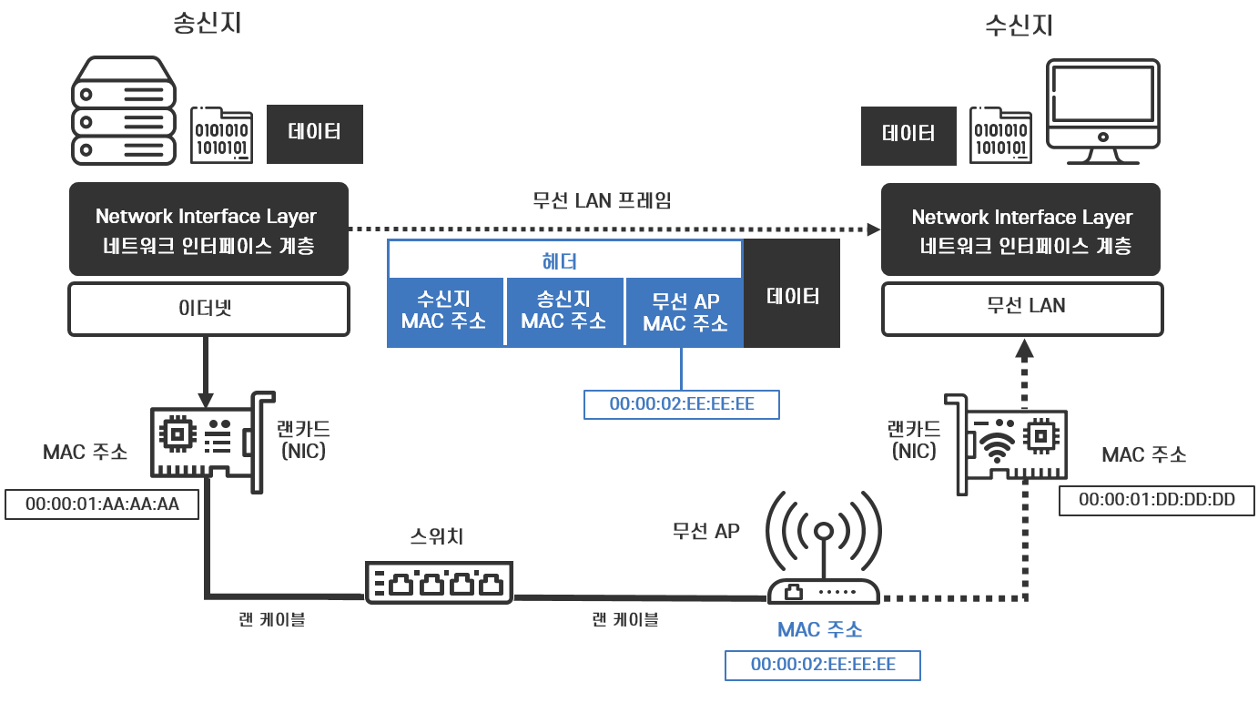 LAN의 표준화 규칙인 이더넷 프로토콜과 무선 LAN 프로토콜은 노드를 식별하기 위한 주소로 MAC 주소를 사용하여 전송 매체를 통해 프레임을 전송합니다. Media Access Control Address를 의미하는 MAC 주소는 이름처럼 전송 매체(Media)에 대한 접근(Access)을 제어(Control)하는 주소, 즉 전송 매체와 연결된 노드 중에 데이터의 수신지 노드를 식별하여 접근할 수 있게 하는 주소입니다.