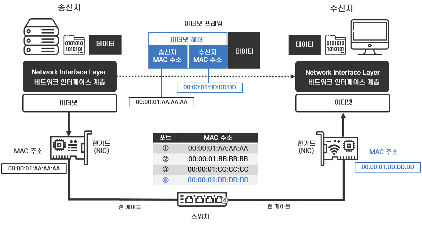 스위치로부터 랜 케이블을 거쳐 이더넷 프레임을 받은 수신지 네트워크 인터페이스 계층은 이더넷 헤더에서 수신지 MAC 주소를 읽고 자신의 MAC 주소와 일치하는지 비교하여 자신에게 온 데이터가 맞는지를 확인합니다. 자신에게 온 데이터가 맞으면 이더넷 프레임에서 이더넷 헤더를 삭제한 데이터(IP 패킷)를 상위 계층(인터넷 계층)으로 넘깁니다. 만약 자신에게 온 데이터가 아니면 프레임을 폐기합니다.