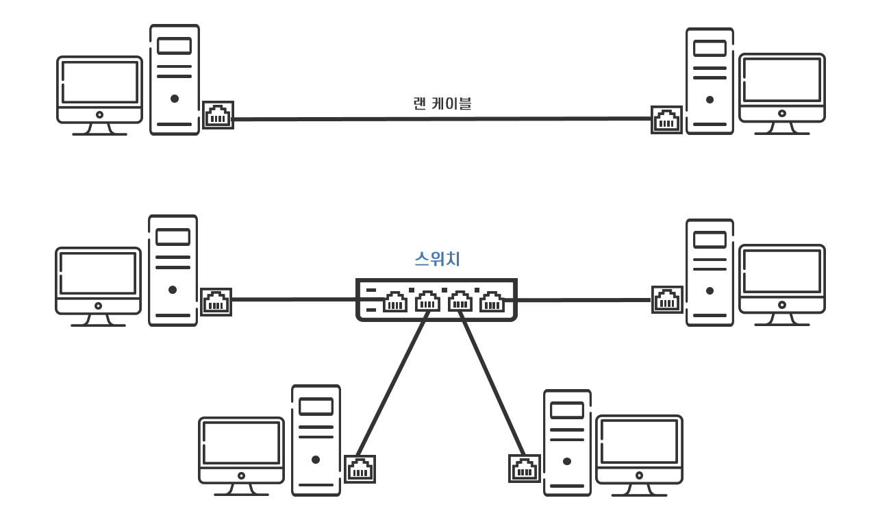 랜포트가 여러 개인 스위치를 중간에 두고 스위치와 여러 대의 컴퓨터를 랜 케이블로 연결하여 스위치를 거쳐 여러 대의 컴퓨터가 동시에 통신이 가능한 소규모 네트워크를 구축합니다. 스위치가 두 대의 컴퓨터를 연결하는 랜 케이블을 분할하고 여러 대의 컴퓨터가 공유할 수 있게 하는 역할을 하는 것입니다.