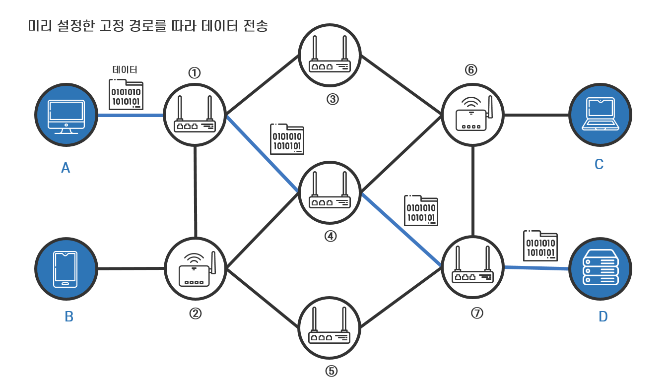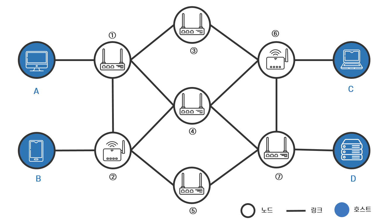 <그림 1>에서 호스트 A에서 호스트 D로 데이터를 전송하는 경우, 호스트 A가 보낸 데이터는 먼저 노드 ①로 전송됩니다. 노드 ①에 도착한 데이터는 자신과 연결된 노드 ②, 노드 ③, 노드 ④로 가는 링크 중 하나를 선택해서 이동합니다. 노드 ④로 가는 링크를 선택한 경우 다시 노드 ④와 연결된 노드 ⑥과 노드 ⑦로 가는 링크 중 하나를 선택해서 이동합니다. 각 노드에서 어떤 링크를 선택하느냐에 따라 호스트 A에서 호스트 D로 데이터가 이동하는 경로는 노드 ① ⇒ 노드 ③ ⇒ 노드 ⑥ ⇒ 노드 ⑦, 노드 ① ⇒ 노드 ④ ⇒ 노드 ⑦, 노드 ① ⇒ 노드 ② ⇒ 노드 ⑤ ⇒ 노드 ⑦ 등 다양합니다.