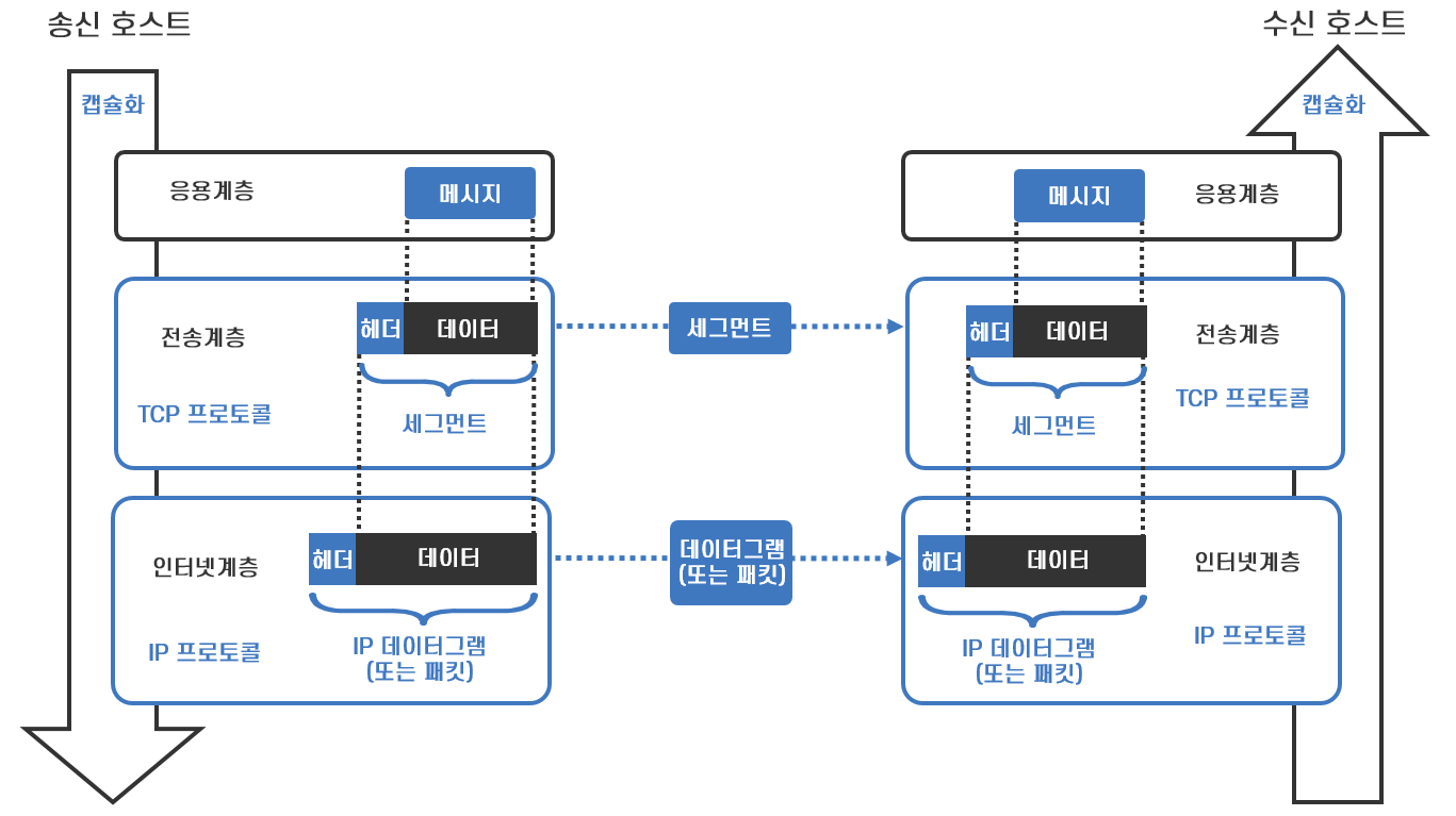 *. 정확히는 전송 계층에서 TCP 프로토콜에 따라 분할한 데이터에 헤더를 붙인 것을 세그먼트라고 합니다. 전송 계층에는 TCP외에 UDP 프로토콜이 있는데 UDP는 데이터를 분할하지 않고 상위 계층에서 받은 데이터에 헤더를 붙이기 때문에 데이터그램이라고 합니다.