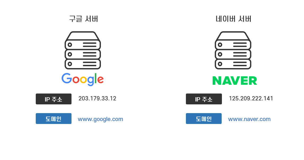 하지만 구글이나 네이버의 웹사이트에 IP 주소를 입력하고 접속하는 사람은 거의 없습니다. 대개는 다른 포털 사이트에서 검색해서 검색 결과의 링크를 타고 웹 사이트를 방문하거나 www.google.com이나 www.naver.com 같은 형태의 영문 주소를 웹 브라우저의 주소 창에 입력해서 웹 사이트에 접속합니다.