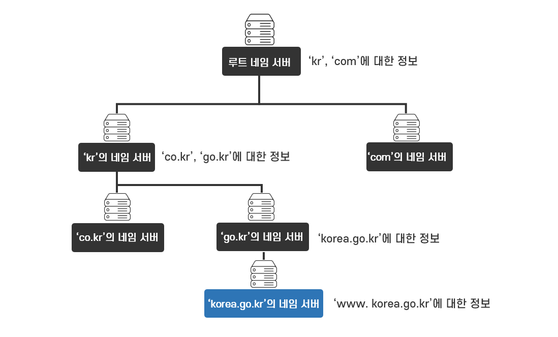 이처럼 DNS는 전 세계의 수많은 도메인을 효율적으로 저장하고 관리하기 위해서 도메인을 계층화하고, 계층의 일부 영역을 네임 서버가 분산 관리하는 시스템으로 설계, 운영되고 있습니다.