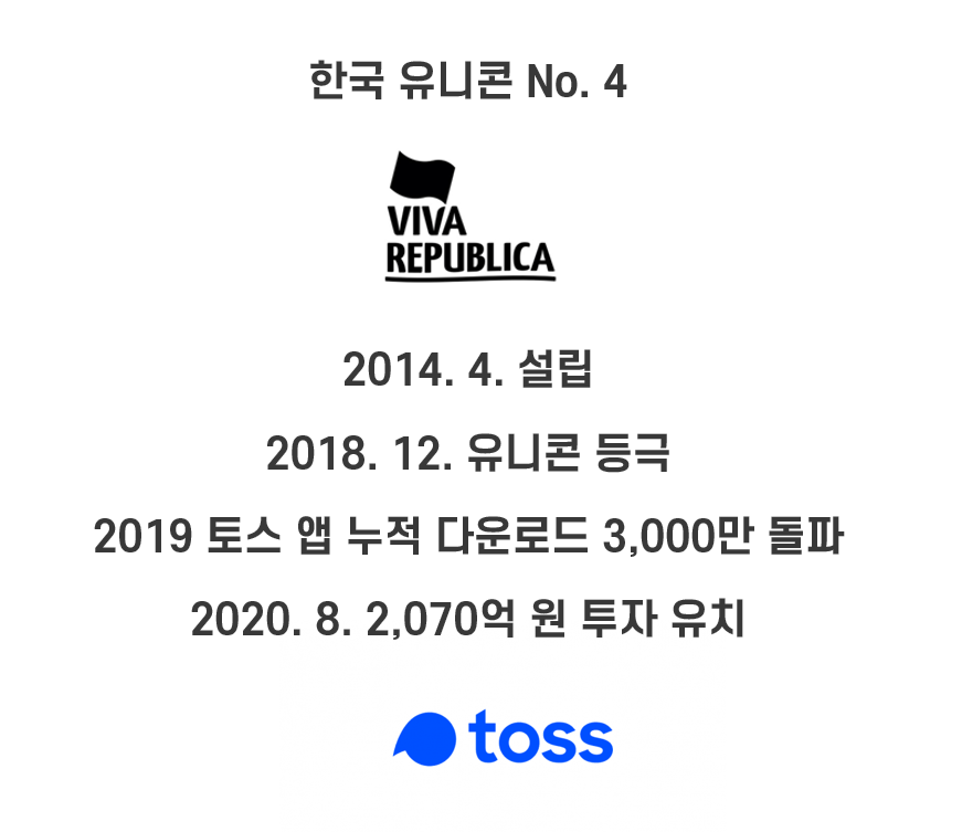 간편 송금 앱 토스(toss)를 개발, 운영하고 있는 비바리퍼블리카가 기업 가치 26억 원으로 2021 한국 유니콘 기업 4위에 올랐습니다.