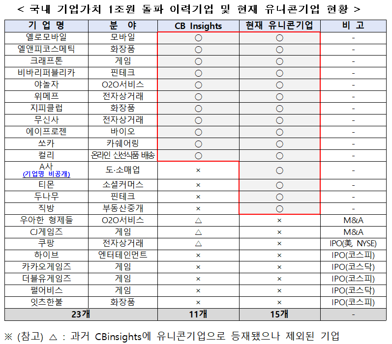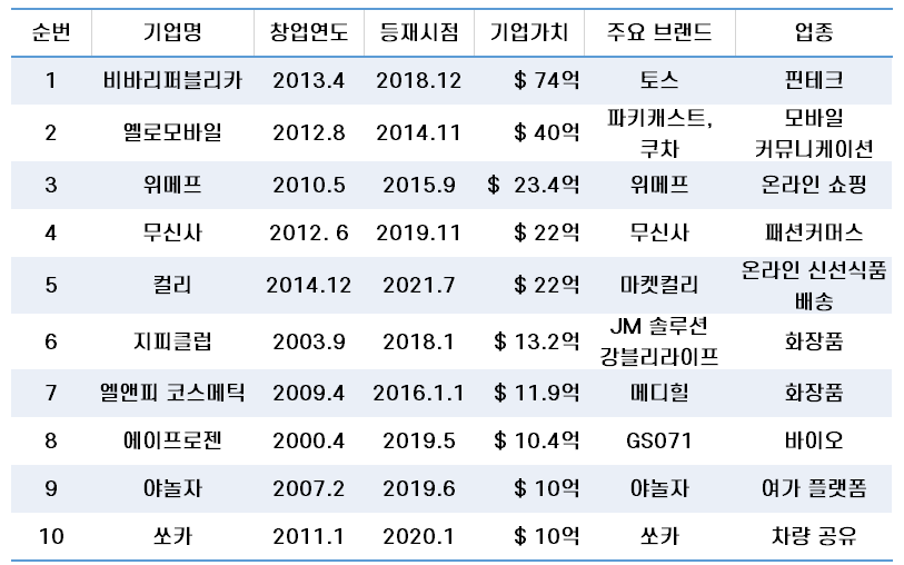 이로써 2021년 8월 15일 현재 CB Insights Unicorn Companies List에 올라 있는 한국 유니콘 기업은 비바리퍼블리카(토스, Toss), 옐로우모바일(Yello Mobile), 위메프(Wemakeprice), 무신사(Musinsa), 컬리(마켓 컬리)Kurly), 지피클럽(GPclub), 엘엔피 코스메틱(L&P Cosmetic), 에이프로젠(Aprogen), 야놀자(Yanolja), 쏘카(Socar)의 10개 기업입니다.