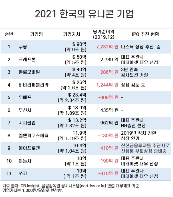2021년 1월 기준 한국 유니콘 기업 리스트와 현황