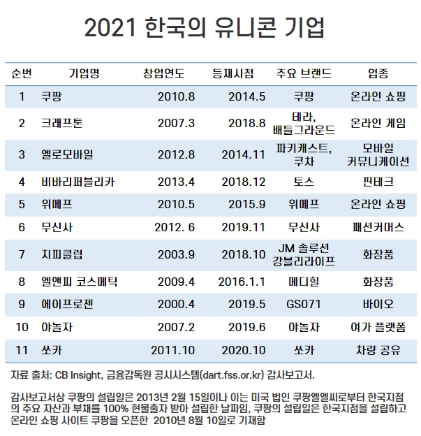 CB Insight(인사이트)가 2021년 1월 기준으로 발표한 한국의 유니콘 기업은 쿠팡, 크래프톤, 옐로모바일, 비바리퍼블리카, 위메프, 무신사, 지피클럽, 엘앤피코스메틱, 에이프로젠, 야놀자, 쏘카의 11개 기업이었습니다.