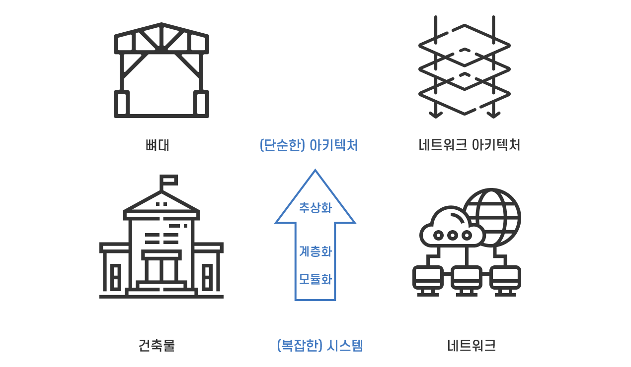 *. 구조라는 뜻을 가진 아키텍처(architecture)는 건축물의 뼈대인 기본 구조를 의미합니다. 건물을 지을 때 전체 구조를 관리하기 위한 설계에서 유래한 아키텍처는 복잡한 IT 시스템의 전체 구조를 관리하기 위한 개념으로 많이 활용됩니다. 컴퓨터 아키텍처, 소프트웨어 아키텍처, 인프라 아키텍처, 데이터 아키텍처 등 다양하게 사용되고 있습니다.