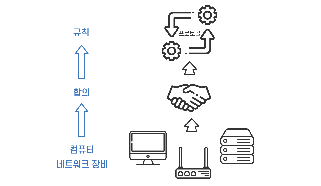 2대 이상의 컴퓨터와 다양한 네트워크 장비가 모인 네트워크에서도 마찬가지로 서로 데이터를 주고받기 위해 합의된 규칙이 필요합니다. 사회에서 언어나 법과 같은 역할을 하는 규칙을 네트워크에서는 프로토콜이라 부릅니다. 즉, 프로토콜(Protocol)은 네트워크에서 데이터를 주고받기 위해 네트워크를 구성하는 컴퓨터와 네트워크 장비들이 지켜야 할 규칙입니다. 프로토콜은 데이터를 누구에게, 무엇을, 언제, 어떻게 전송할 것인지, 즉 데이터 전송 상대방, 데이터의 형식, 데이터의 전송 순서와 절차, 데이터 전송 방법 등을 규정합니다. 프로토콜이 규정한 구체적인 내용을 사양이라고 합니다.