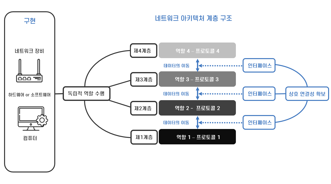 구체적으로 현실에서는 이 설계도에 따라 제작된 컴퓨터와 네트워크 장비의 하드웨어나 소프트웨어가 각 계층의 기능을 구현(implementation)합니다.