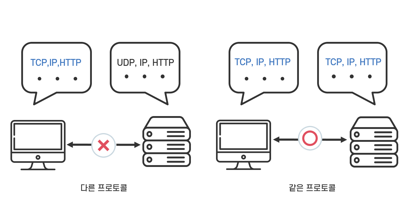 따라서 다양한 언어 중에서 같은 언어를 사용해야 대화가 가능한 것처럼 네트워크에서도 데이터를 성공적으로 전송하기 위해서는 컴퓨터와 네트워크 장비들이 같은 프로토콜 조합을 사용해야 합니다.