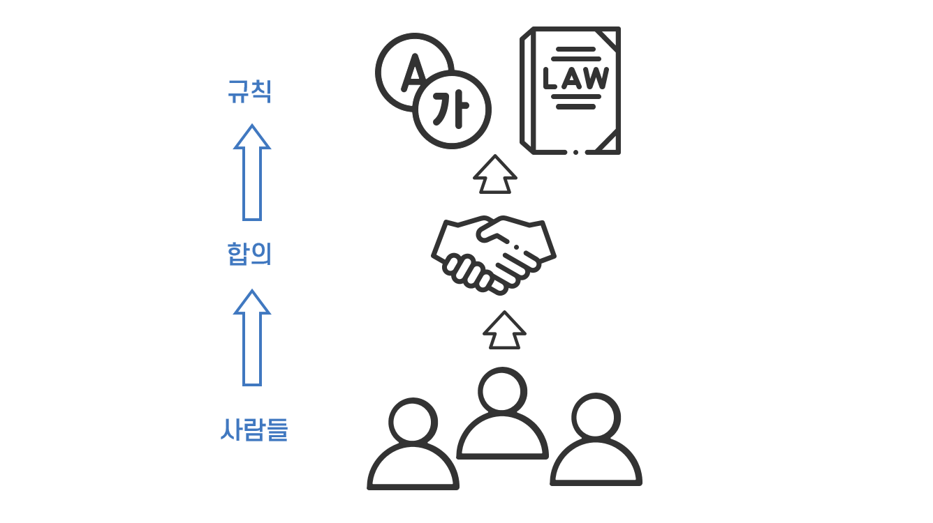 2명 이상의 사람들이 모인 사회에서는 서로 대화하고 질서를 유지하기 위해 합의된 규칙이 필요합니다. 서로 대화하기 위해 언어라는 규칙이 있고, 사회 질서를 유지하기 위해 법과 같은 규칙이 있습니다.