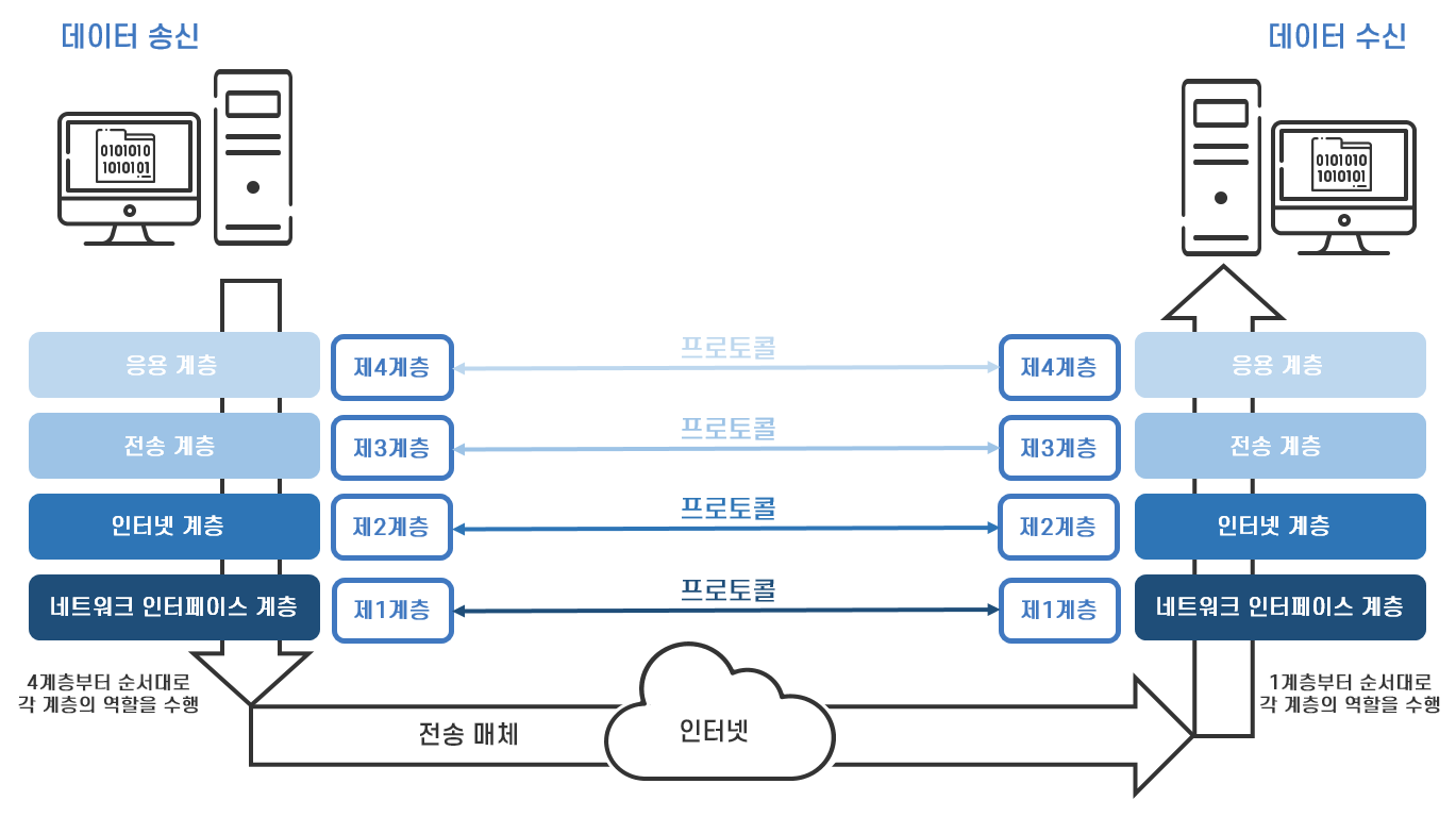 TCP/IP 모델에 따라 컴퓨터 간에 데이터를 주고받는 과정은 <그림 9>와 같습니다. 데이터를 송신하는 컴퓨터는 제4계층부터 순서대로 각 계층의 역할을 수행하고, 데이터를 수신하는 컴퓨터는 제1계층부터 순서대로 각 계층의 역할을 수행합니다. 데이터를 송신하는 컴퓨터와 수신하는 컴퓨터 모두 각 계층이 역할을 수행할 때마다 각 계층이 요구하는 동일한 프로토콜을 따르기 때문에 인터넷을 통한 데이터 통신이 이루어집니다.