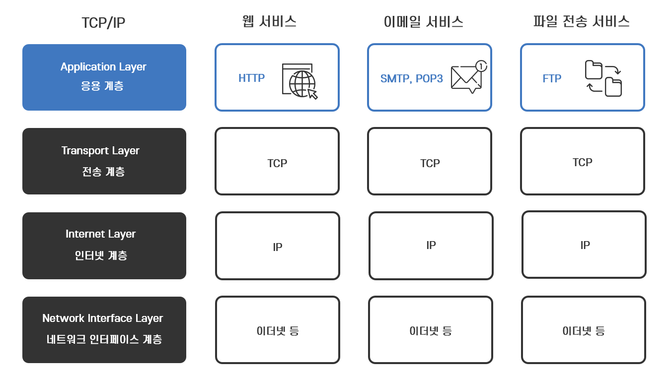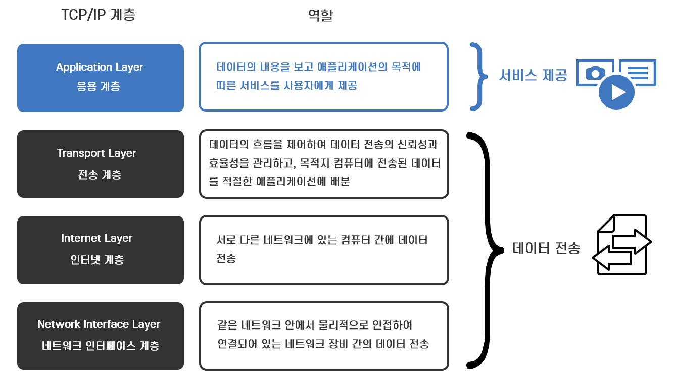 4개의 계층 중 응용(애플리케이션) 계층이 웹서비스, 이메일, 파일 전송 등과 같은 서비스의 내용을 결정하는 유일한 계층입니다. 응용(애플리케이션) 계층은 데이터의 내용을 보고 그에 맞는 서비스를 처리하는데 집중하고 데이터 전송은 나머지 3개의 하위 계층이 담당합니다. 즉, 응용(애플리케이션) 계층은 인터넷 사용자에게 서비스 관점에서 편리한 서비스를 제공하기 위한 것이며, 하위 계층은 데이터 관점에서 안정적인 데이터 전송을 책임지는 것입니다.