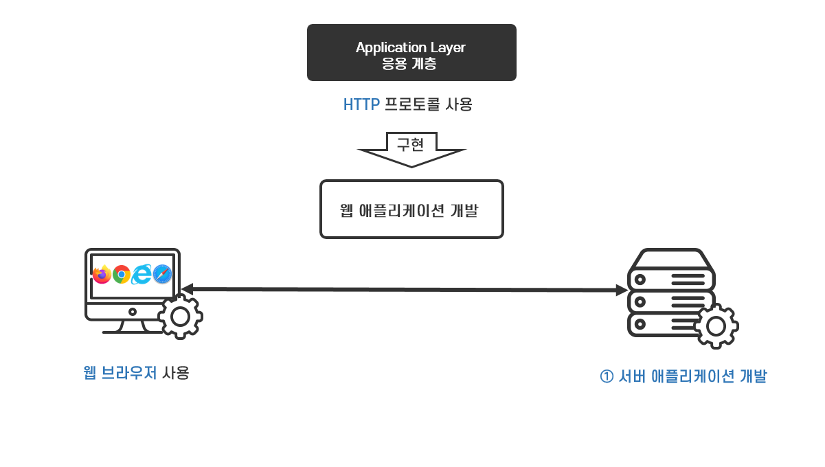 따라서 웹의 형태로 새로운 서비스를 만들 때, 즉 웹 애플리케이션을 만들 때는 이미 개발되어 있는 다양한 웹 브라우저와 HTTP 프로토콜을 이용하면 됩니다. 즉 클라이언트 애플리케이션과 응응 계층의 프로토콜 개발없이 서비스를 제공하기 위한 웹 서버 애플리케이션만 HTTP 프로토콜을 적용해서 개발하면 되는 것입니다. 카카오톡 서비스와 같이 통일된 프로토콜이 없는 새로운 서비스를 만들 때와는 훨씬 적은 비용과 노력으로 개발이 가능해집니다. 이런 이유로 인터넷과 웹 서비스를 혼용해서 사용할 정도로 대부분의 인터넷 서비스가 웹을 이용해 제공되고 있습니다.