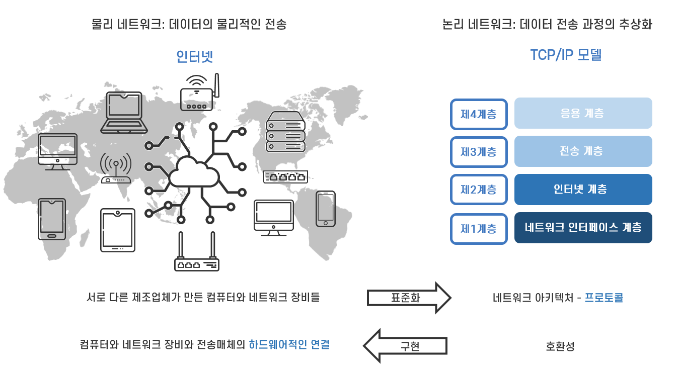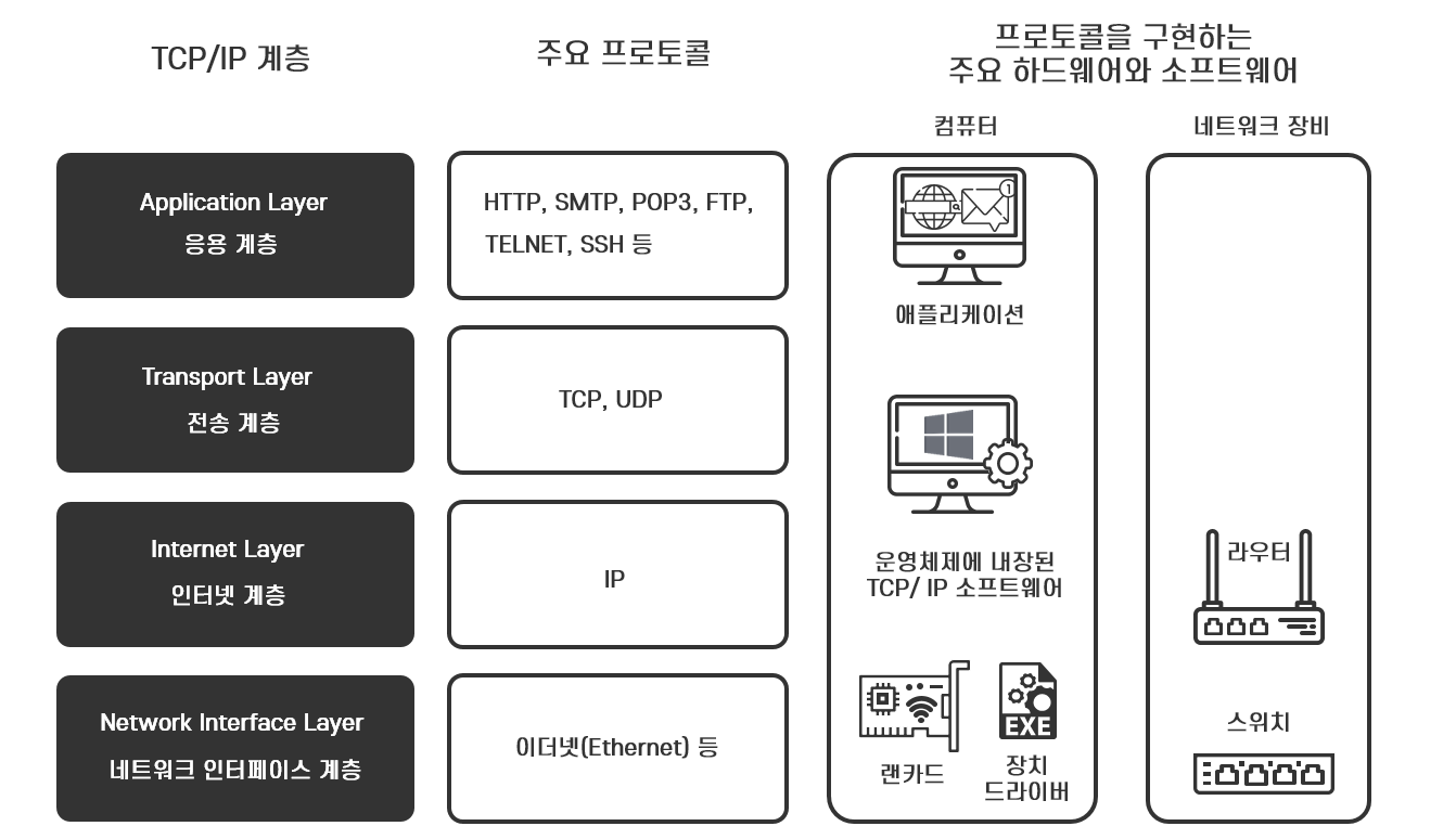 오늘날 어떤 컴퓨터를 사용하든 전 세계 어디에서나 인터넷에 접속할 수 있는 것은 대부분의 컴퓨터와 네트워크 장비가 인터넷의 표준인 TCP/IP 모델의 프로토콜에 따라 만들어졌기 때문입니다. 즉, 기기의 하드웨어는 프로토콜이 정하는 표준 규격에 따라 제작되고 소프트웨어는 프로토콜이 정한 데이터의 전송 순서와 절차, 데이터 전송 방법 등을 구현할 수 있도록 프로그래밍되는 것입니다.