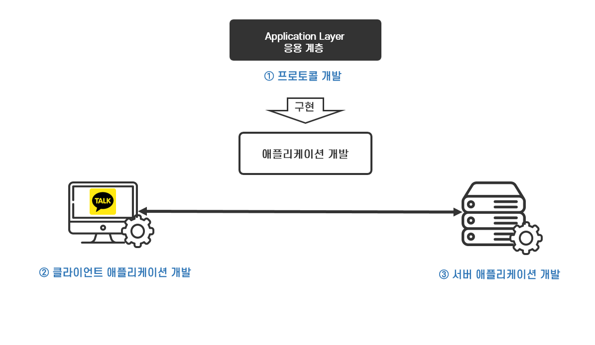 지금은 전국민이 사용하는 앱이 된 카카오톡 앱은 카카오톡 서비스를 개발할 때 새롭게 만든 프로토콜에 따라 프로그래밍된 클라이언트 애플리케이션입니다. 카카오톡 서버가 제공하는 인스턴트 메시징* 서비스를 이용하려면 사용자는 전용 클라이언트 애플리케이션인 카카오톡 앱을 설치해야 합니다. 카카오톡 서비스를 만드는 입장에서는 ① 카카오톡 서비스를 제공할 카카오톡 서버 애플리케이션(카카오톡 서버), ② 카카오톡 서버를 이용하기 위한 클라이언트 애플리케이션(카카오톡 앱), ③ 카카오톡 서버와 카카오톡 앱이 통신할 수 있는 프로토콜을 개발해야 하는 것입니다.