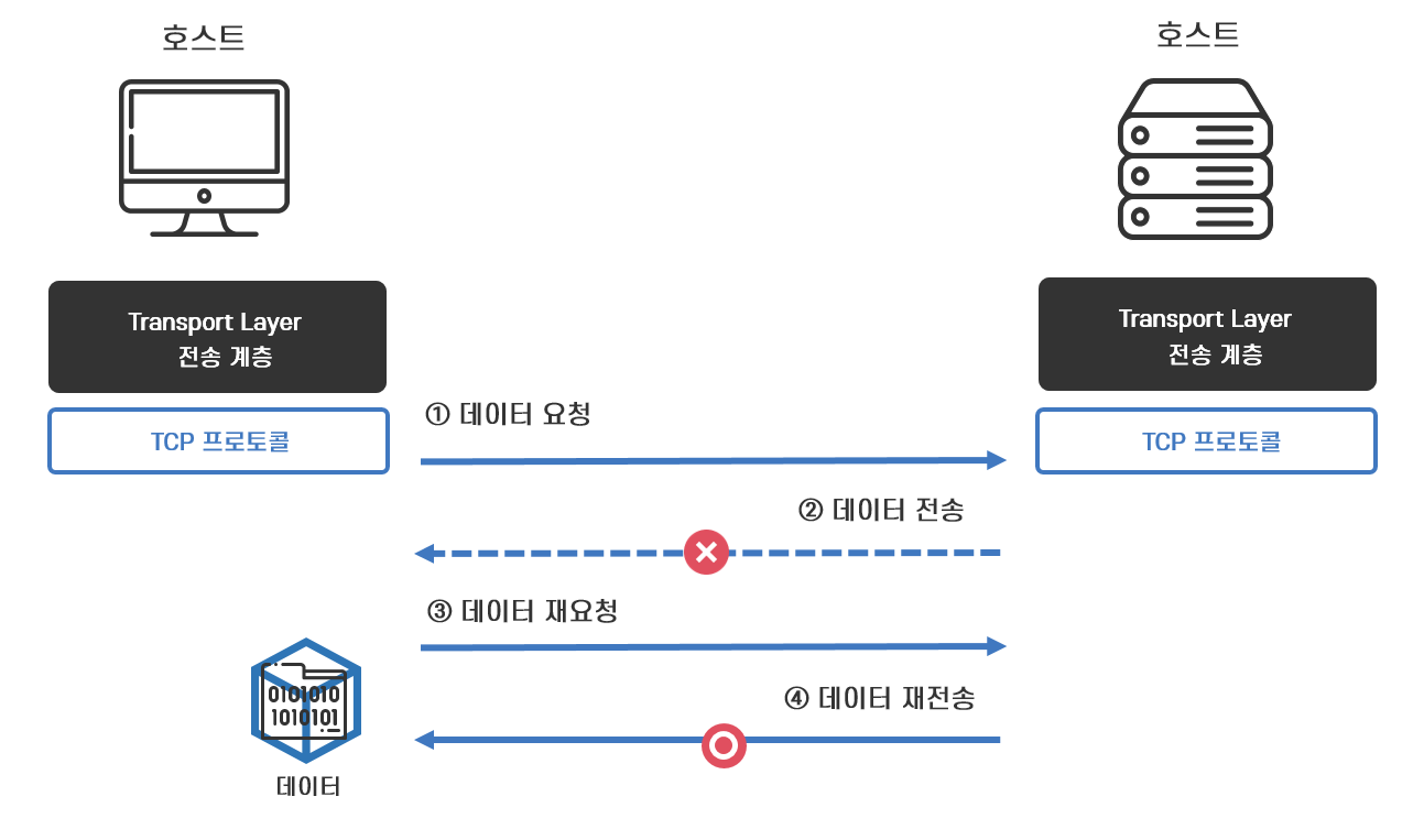 네트워크 인터페이스 계층과 인터넷 계층은 정확한 데이터의 수신지 컴퓨터까지 최적의 경로를 찾아 데이터를 전송할 뿐 데이터 전송의 신뢰성이나 수신지 컴퓨터 내에서 데이터의 배분에는 관여하지 않습니다. 전송 과정에서 데이터의 손상이나 유실없이 제대로 전달되는지, 데이터가 효율적으로 전달되는지, 목적지 컴퓨터 내의 어떤 애플리케이션에 데이터를 전달해야 하는지는 전송 계층에서 처리합니다. 웹 브라우저로 여러 개의 웹사이트에 접속하거나 웹 브라우저뿐만 아니라 카카오톡 등 여러 애플리케이션으로 동시에 인터넷을 사용하더라도 문제없이 애플리케이션이 동작하는 것은 바로 이 전송 계층의 역할 덕분입니다.